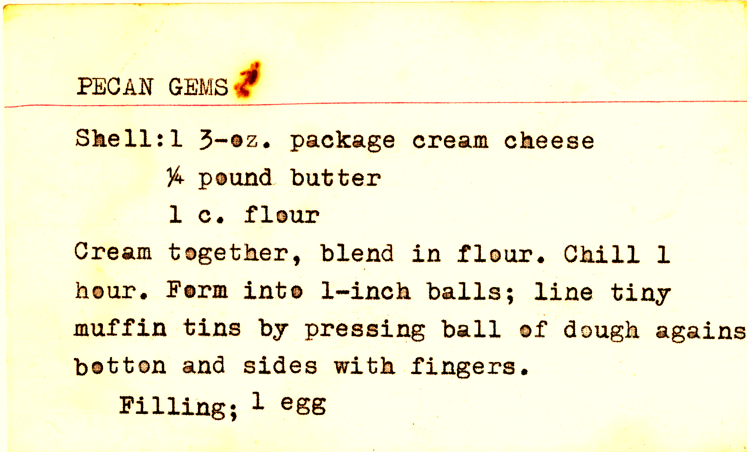 The shell is made from cream cheese, butter, and flour, pressed with the fingers into mini-muffin tins. The filling is classic pecan pie, eggs and dark brown sugar, butter, vanilla. “Makes approx. 24” is the final phrase typed on the card.