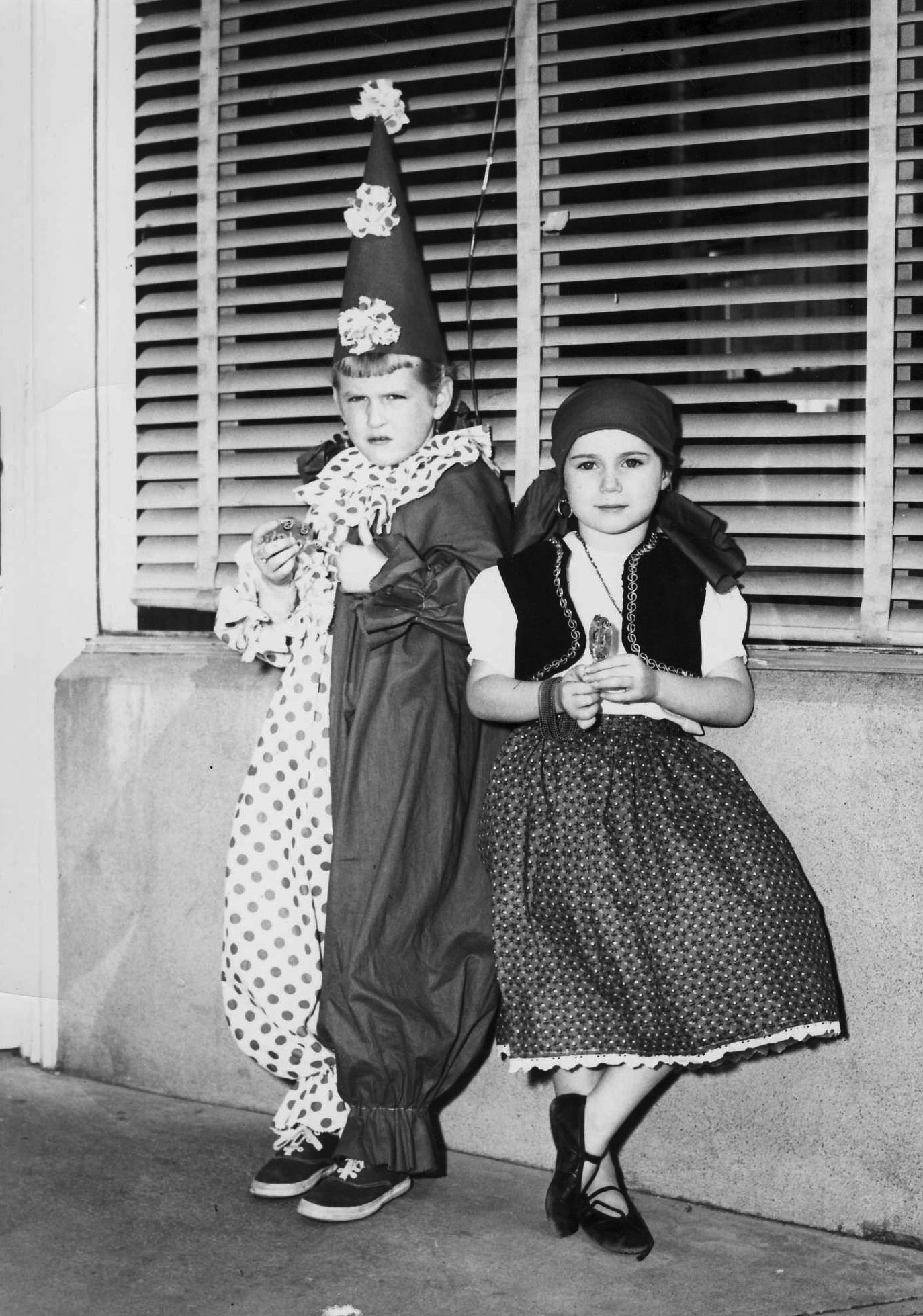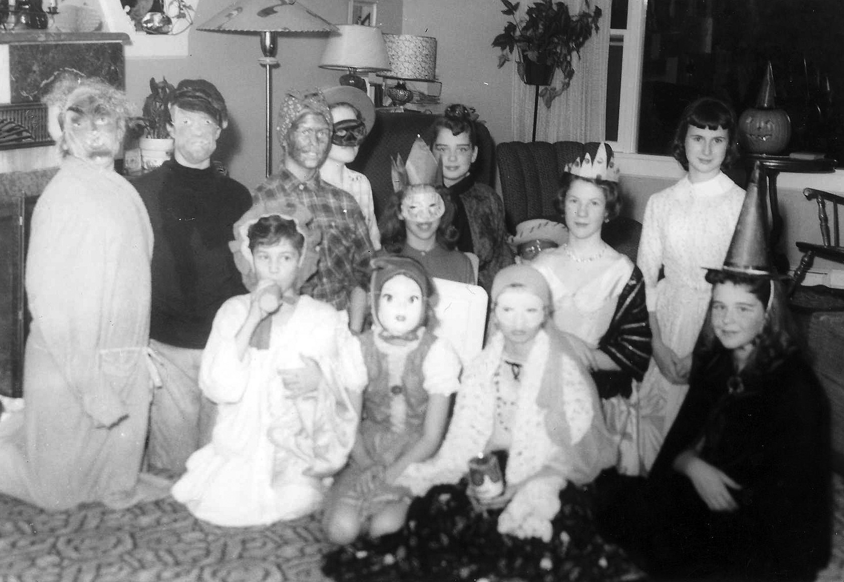 These costumes were for school. The little ones didn’t actually go out trick or treating. But by third grade, you were considered old enough to venture out into the unlighted night on your own. Generally, people went with their siblings or other neighbor children. Since I was the youngest in my family, and lived in an isolated area, I would find friends who lived in neighborhoods I wanted to canvas.