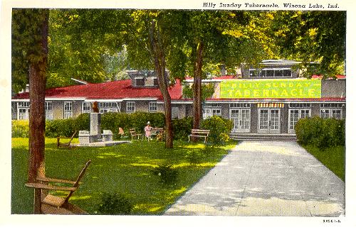 “… I spent my child’s summers in northeastern Indiana, visiting my relatives in a strange religious resort. Winona Lake was a benign cult headquarters. In its heyday it was the home of evangelist Billy Sunday, famous for his tabernacles and sawdust trails. His first cavernous hall stood at the center of Winona Lake. Spreading out from there were the grounds of his kingdom: an outdoor amphitheater, formal gardens and parklands … I loved the Billy Sunday grounds, so different from the suburbs of the rest of my year. There was a swan pond and a grotto. There were fountains and statuary, to provide destinations for the paths that wound along under the shade trees. All were over-grown, tumbled-down, dank.”
