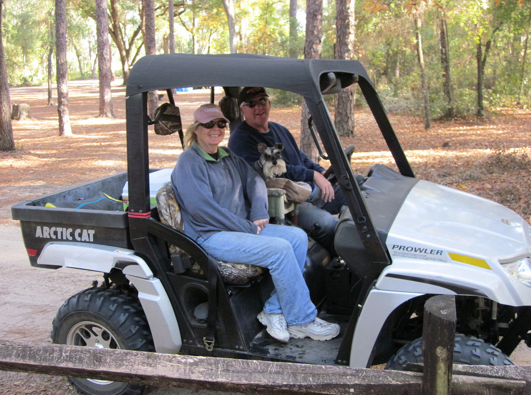 Who would have thought a year ago (when we were snowmobiling on the endless trails of northern Wisconsin) we would today be down here, out on these sandy trails in a new Polaris mini-Jeep. The yellow coded “Long Leaf” trail is a challenge, as it’s barely wide enough to accommodate the Jeep, meaning the branches are in our faces a lot. Also some curvy turns are so sharp we have to watch that the top bars of the Jeep don’t catch the tree branches as we tilt-a-whirl on through. Then we hit a series of mounding bumps, sometimes dozens in a row, left behind from the 4-wheelers. What a RUSH, haven’t been on a ride like that since my last visit to Great America Amusement Park.