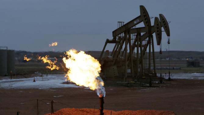 Dec. 17, 2014. Oil pumps work behind a natural gas flare near Watford City, N.D. (AP Photo/Eric Gay, File)