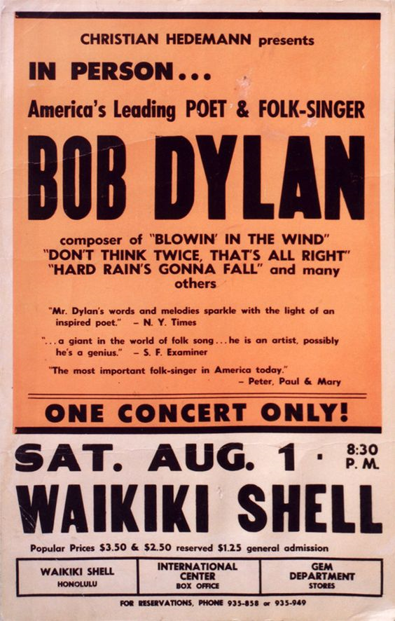 August 1, 1964—six days before my 18th birthday—Bob Dylan played the Waikiki Shell in Honolulu. Billed as “America’s foremost poet and folksinger,” I had never heard of him. Friends said “We gotta go,” so that Saturday night we descended on the Shell.