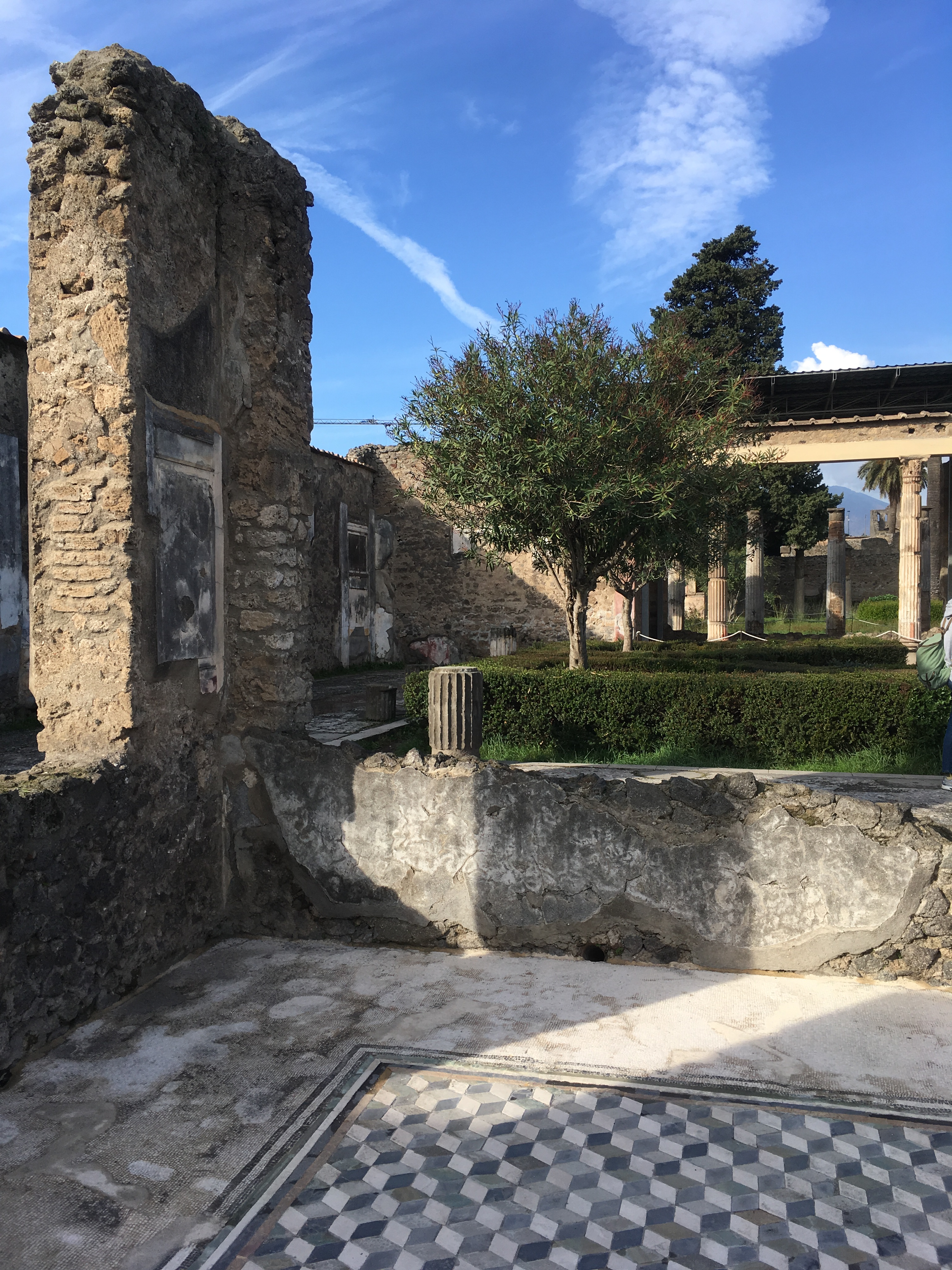 The entrance opened into a huge courtyard lined with huge columns in varying stages of preservation. We saw their basic construction of bricks covered with plaster. God and goddess statues had been in this hall, but all statuary had been moved to a museum in Naples. A few modern art pieces had been added, a puzzling contrast. An archway led to a piazza roughly the dimensions of a football field, lined on each side by what had been places of business and commerce, the Forum, or seat of business and government. The East side was now a fenced-in display of pottery and tools which had been unearthed. One very sad display was a cast made of one of the mummified bodies unearthed in the past century. Very much was intact. A pause at the very modern visitor center for refreshment of various sorts, and on we went to one of the public baths. The tile work and ritualistic set-up of one room leading to the next was fascinating. Here as everywhere was evidence of privilege served by menial labor.