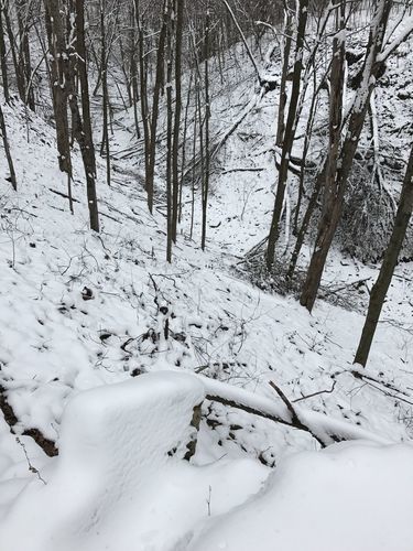 We drove an hour into the hills, then parked at the side of the road at the base of Pine Hollow, west of Baraboo. We hiked up the frozen creek, working hard as we clambered over fallen tree branches from winter storms. Water burbled happily under the layer of ice in the hollow. Owls hooted from the ridgeline.