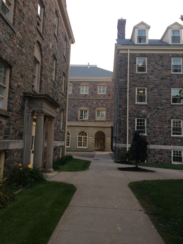 This little alley leads to the classroom building where we meet, center rear. Dorms to either side–that’s “Radical Bay” to the left, and “The North Pole” to the right, where I live. The names are ironic–“Radical” because that’s where the seminary students lived, “North Pole” because it was closest to the boiler room.