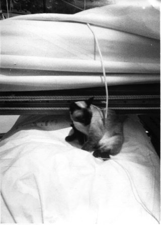 September 7 thru 29 – Cannes – As we came back to the Yacht Port in Cannes from doing our shopping, we heard her screaming. We knew it was Anitra – there was no doubt. We thought maybe a dog had found her tied to the mainmast in her harness; my brothers took off running for the boat. We found her over the side with her “tail end” just in the water. She had tried to jump to the boat next to us, but her harness rope wasn’t long enough. The boys pulled her back up on deck and Jan took her below to dry her off. After this episode, Mom decided to have Anitra “fixed”. Pequeñas Cosas! Carl, Jan and I went with Mom to the vet. Mom didn’t speak much French, but she made herself understood by making a scissor sign with her fingers. We left her overnight, which was difficult. It took Anitra several days to recover, but after that she was easier to handle and she quit trying to leave the boat.
