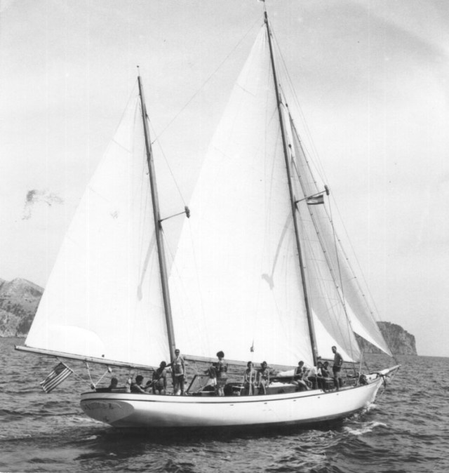 Our first “shakedown” cruise took us around the Island of Mallorca and over to Ibiza, then back to Puerto before leaving for France. I got seasick as soon as we hit the open sea. My brothers had made several trips with Dad, but this was the first time for the rest of us including our dog Rusty and cat Anitra.