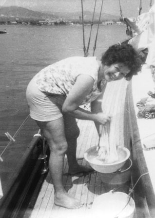 We thought we’d lost Anitra not long after we headed out, but we found her hidden in the towels in the “head.” Whenever Rusty needed to relieve herself, she would go to the stern of the boat and bark. The boys would pull the dingy we towed up alongside, Rusty would jump in and do her duty, and then one of the boys would reach down and pull her back on board, while under full sail. When we came into a harbor for the night, the boys took turns taking the dingy ashore to clean it out.