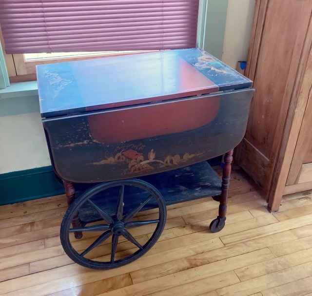 It is 28 inches long, 18 inches wide, and 26 inches high. It has big wheels at one end and little wheels on the end of legs at the other. Two rounded, drop-down panels can pop up to turn it into a table. A handle folds away at the end with the legs. It is of a style popular in the early 20thcentury—Japonerie. Vaguely Asian scenes are embossed on the drop-down panels. When it was produced in the 1920s, it was designed to live in a formal parlor and be wheeled into position for tea service.