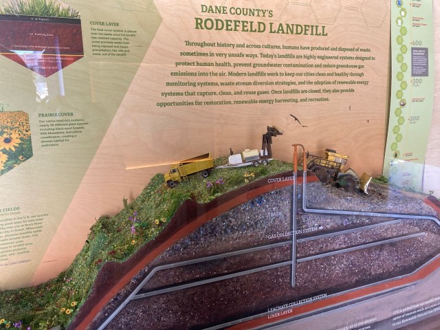 One Saturday recently I happened across a pop-up event at the Garver Feed Mill, a project of the Dane County Department of Waste & Renewables in collaboration with Madison Children’s Museum. It featured a trailer about the size of that dumpster, outfitted with art made from trash and educational panels explaining what happens at the landfill. “The Trash Lab is a mobile exhibit designed to educate and motivate us to create less trash and rethink our relationship with waste,” says its website.