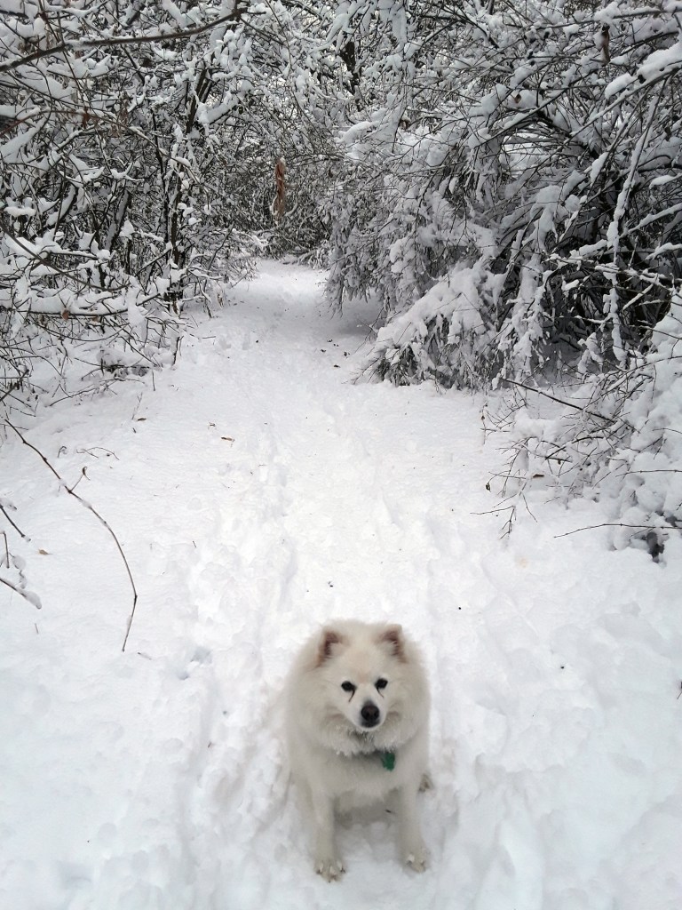 Snowball blasts out of the car like he doesn’t know I will grab his leash before he gets far. If there is nobody in sight, I let him run off-leash. He trots around with his nose to the ground and leads the way to the trail. The trail is less than a mile long, but Snowball’s forays into the woods make his run about double. Snowball is an American Eskimo, and in the winter he is in his element. Once he gets on the trail, he starts out running full speed for five or ten seconds, then he flips onto his back and wiggles around in the snow for a few seconds, turns over, takes a bite of snow, and takes off again. These antics never get old; for him or for the entertainment value. Recently, someone built a snow figure near the start of the path and each time we walk, it’s more yellow. If Snowball smells a particularly fresh patch of yellow snow, he will roll in it, making a doggie angel. Soon after arriving he does his business.