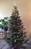 Then last year, Covid arrived, and we didn’t want to be around throngs of merry lumberjacks, so we opted to mask up and buy a tree from a garden center during their least busy time of the week. We quickly chose a very moderate Fraser fir, the best for holding onto its needles. Once in place, it looked just as fresh as if it were newly hewn.