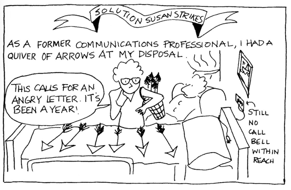 In the lecture hall at U-King’s Susan stood out—she was the one with a sketchbook open at all times. She drew simple cartoon depictions of everything happening around her. This was a habit, she explained, that she’d picked up while visiting her mother in long-term care, where it helped her manage her anxiety. Now, she had an idea that she might write a graphic memoir about the nine years she spent as her mother’s advocate with the Canadian long-term care system.