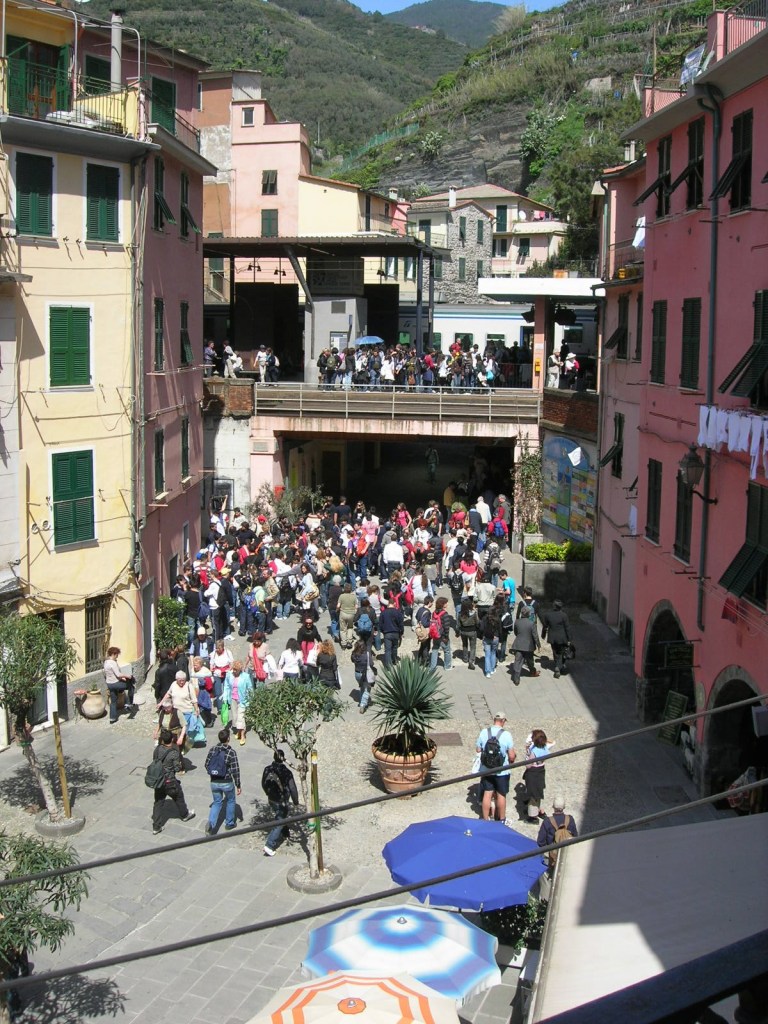 We shuffle shoulder to shoulder toward the plaza surrounded by people descending from the train station. Even more people are spurting out of cracks between the buildings. I spot the white/red paint slashes that are the markings of the C.A.I. trails (Club Alpino Italiano) this area is famous for. Hikers who began the day in villages north or south of Vernazza are arriving, just in time for lunch.