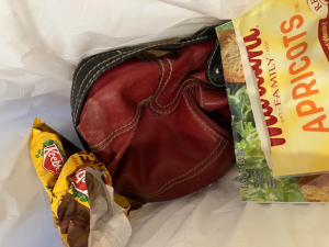Returning home, I showed the purse remnants to my son and amused him by dropping it emphatically into the trash,